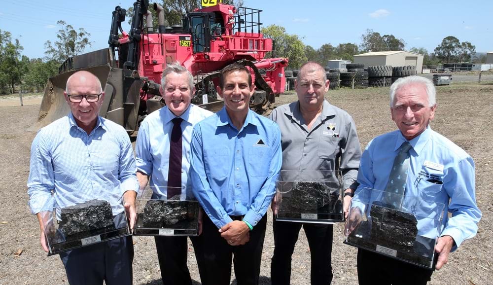 Past chief operating officer for New Hope Group Bruce Denney, Queensland Resource Council chief executive Ian Macfarlane, West Moreton Operations general manager Trent Knack, CFMEU’s Shane Brunker and Ipswich Historial Society president Hugh Taylor with the last coal mined from Jeebropilly Mine. Photo: Jodi Richter, Ipswich First.